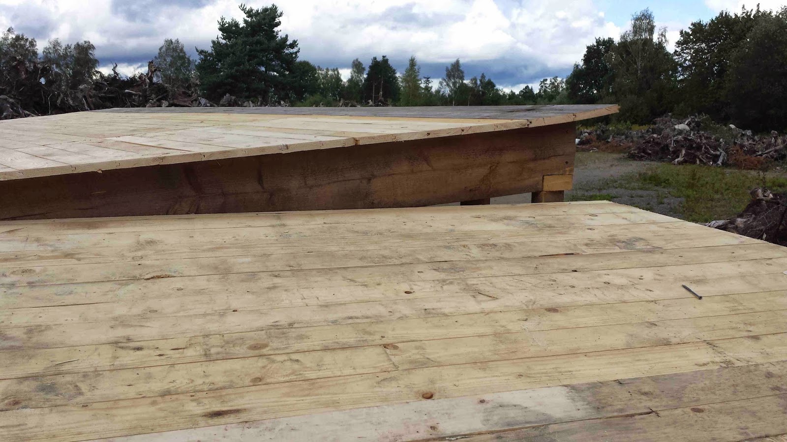 Efter mycket diskussion var vi överens om hur vi skulle göra fasaden. Det är ett återbruksprojekt så vi får använda det material som vi har. Det finns ändå utrymme och material för flera olika lösningar och vi bestämde oss att testa lite sorters fasad. Det blir träspån och vertikalpanel på framsidan av det stora huset och liggande panel i samma vinkel som taket på framsidan av det lilla huset för att förstärka vinklarna. Vi satte läkt ovanpå vindpappen, dels för att skapa luftrum mellan yttervägg och vindpapp, dels för att få fasaden måste fästas i något. Luftrummet är till för att fukt kan torka bort vad jag förstå.